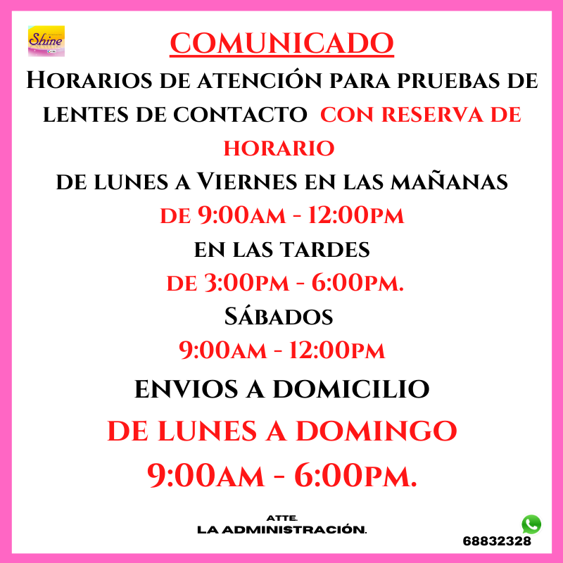 . Realizamos prueba de lentes de contacto de los colores que gustes por el costo de 5Bs. cada prueba, solo precisas realizar una reserva de horario indicando tu nombre completo e indicar el horario que puedes visitarnos.